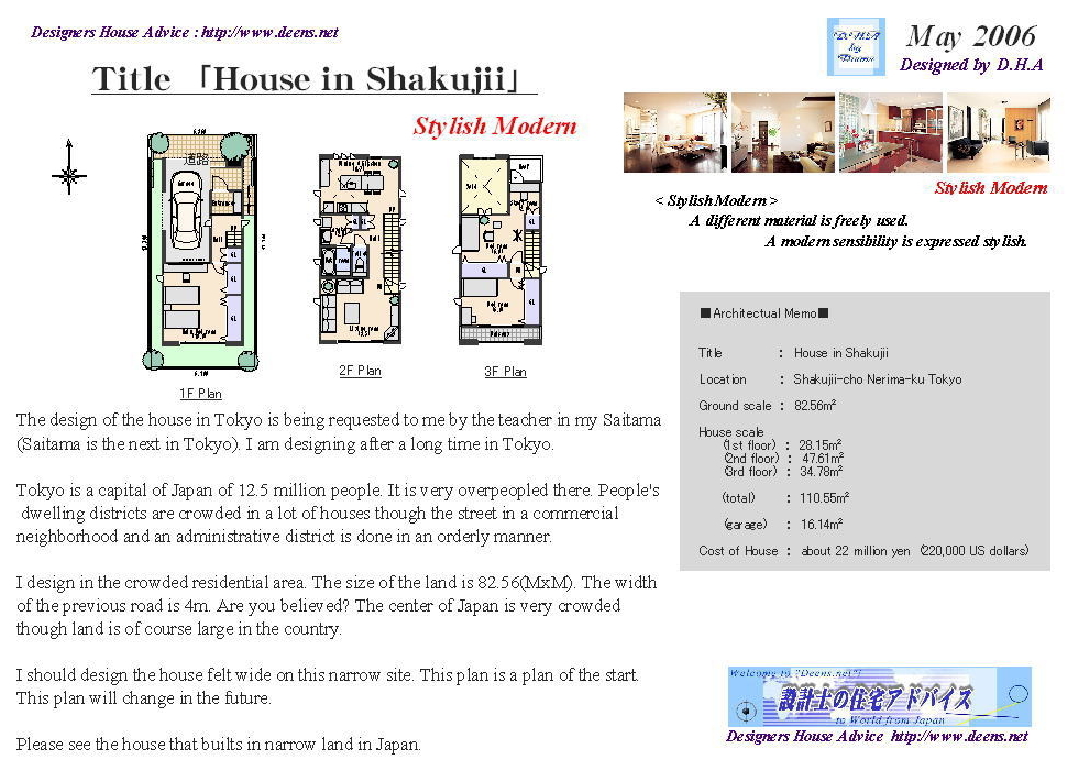 | The design in Tokyo is after a long time for me. The population of Tokyo is 12.5 million people. The building has been very overcrowded to Shakujii in Tokyo. The size of this site is 82.56 slightly. The width of the road in front of the site is 4m. Do you understand how it to be narrow? Of course, there is a big site in Japan, and are a lot of narrow at the same time sites. I introduce the house in Japan that builts in this narrow land. As for you, can Japan live? I want to have knowledge about circumstances of the foreign country. I am waiting for your opinion. |