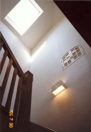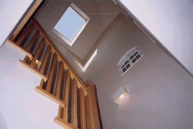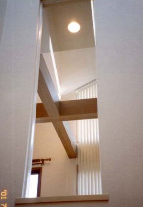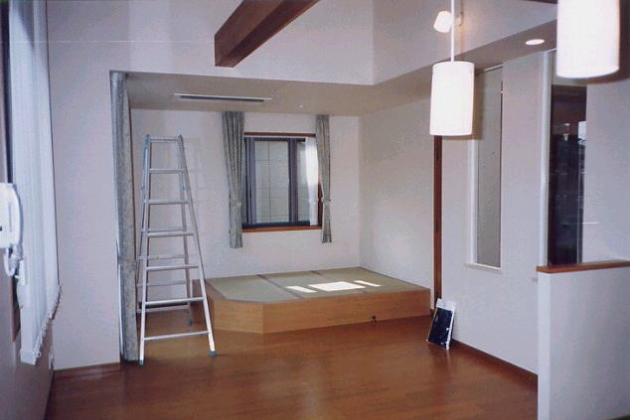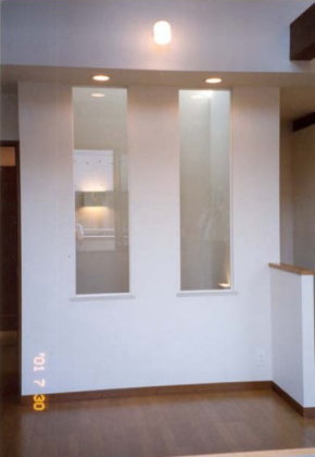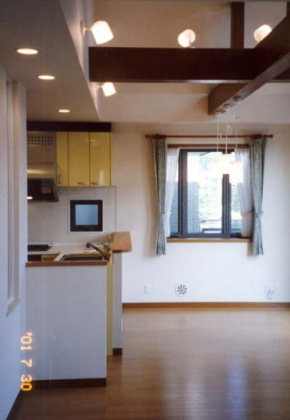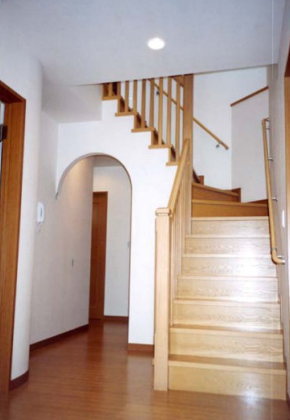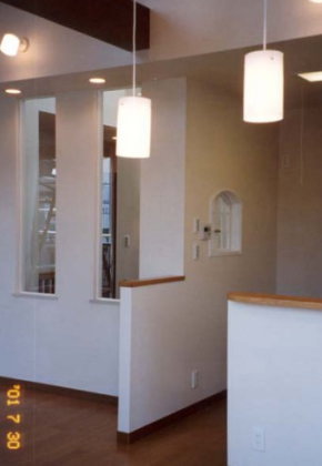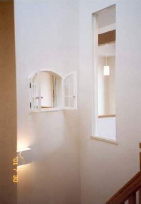 | "I want to do to the roomy house brightly." The customer said such a demand in the first design consultation association. This region cannot build the building of great dimensions. There is a limit in the size. And, this site is small. Therefore, I tried to widen the space in the sight. To widen the house, I thought about some devices. This house has living in the second floor. Moreover, the space of the attic is used. Moreover, the window was set up on the wall of the boundary in the stairway and the living room. This window connects two spaces, and makes a wider space. Please see. |